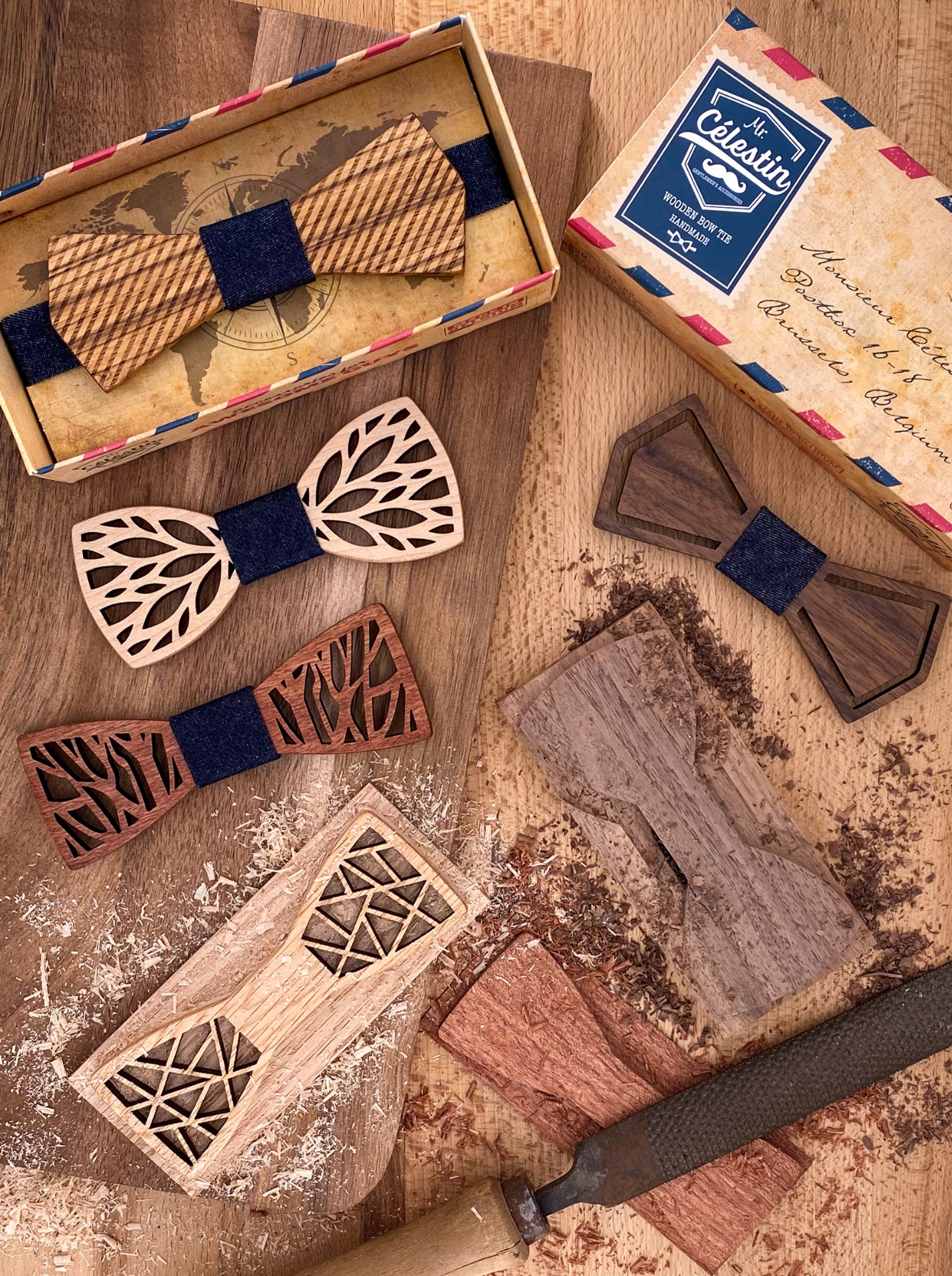 Fabriqués à la main par des artisans ébénistes et sublimés par nos créateurs, les nœuds papillon en bois Mr. Célestin se déclinent en six essences et en une multitude de formes et de designs.